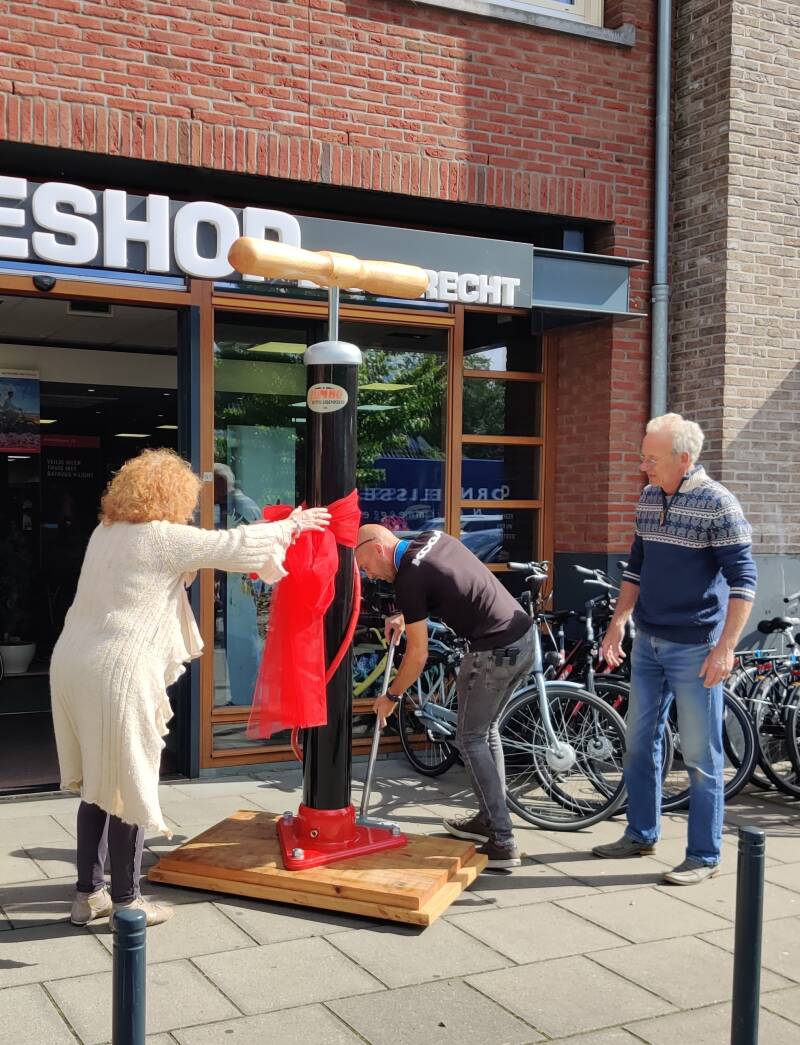 Na een korte (doch langzame!) rit kwamen we aan bij Bikeshop Loosdrecht en plaatsen we de pomp, eigenaar Co Verhoef (met klein pompje!) was zeer blij!